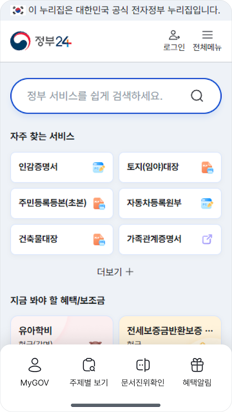 - 앱 설치: 구글플레이스토어 또는 앱스토어에서 '정부24'