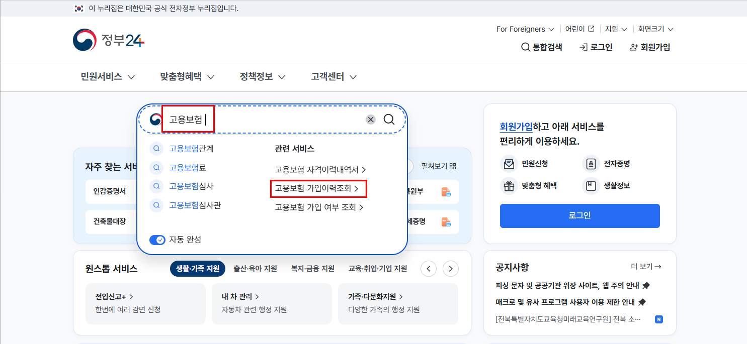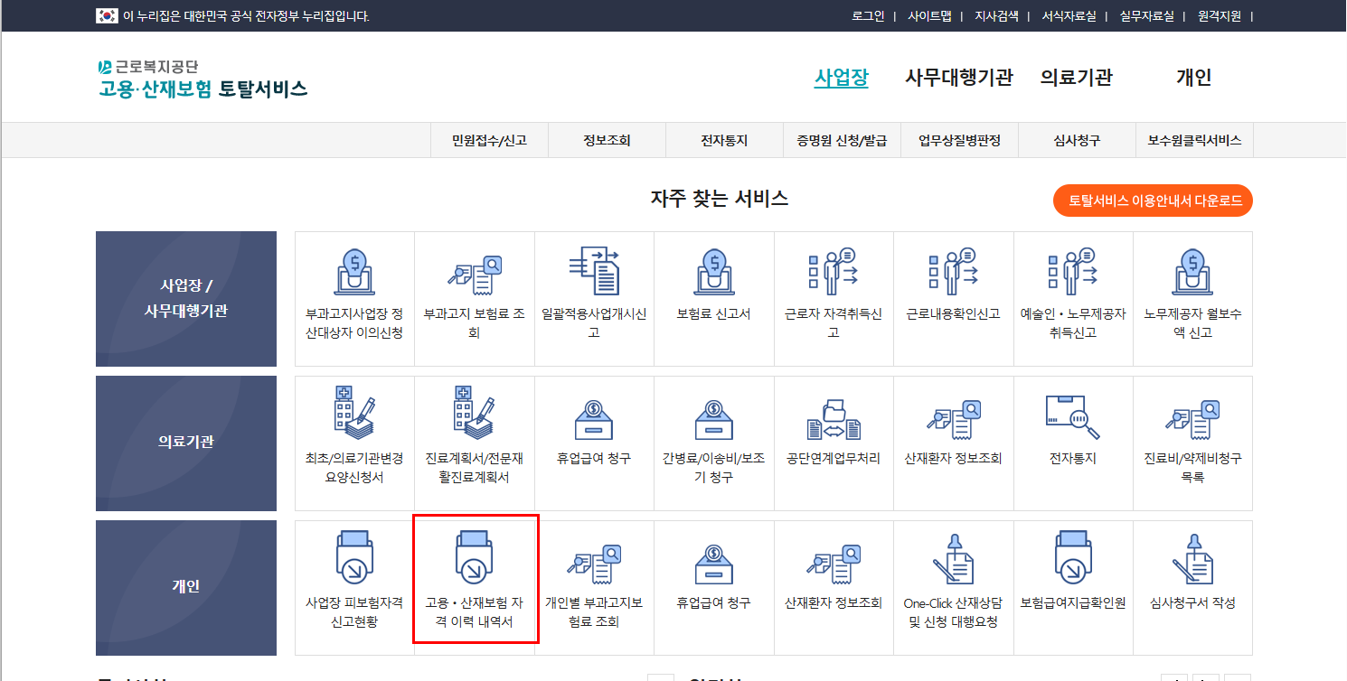 - 검색: '고용보험 자격이력내역' 또는 '고용보험 가입이력'