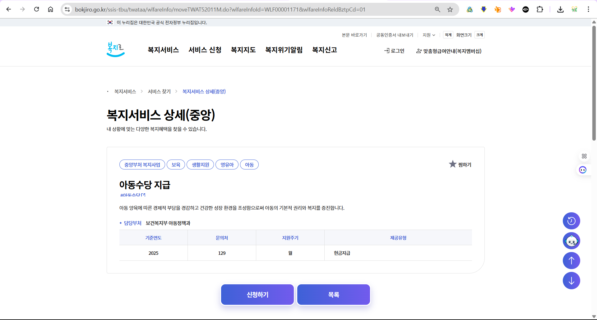 현재 지급 대상: 만 8세 미만 모든 아동 (소득/재산 무관)