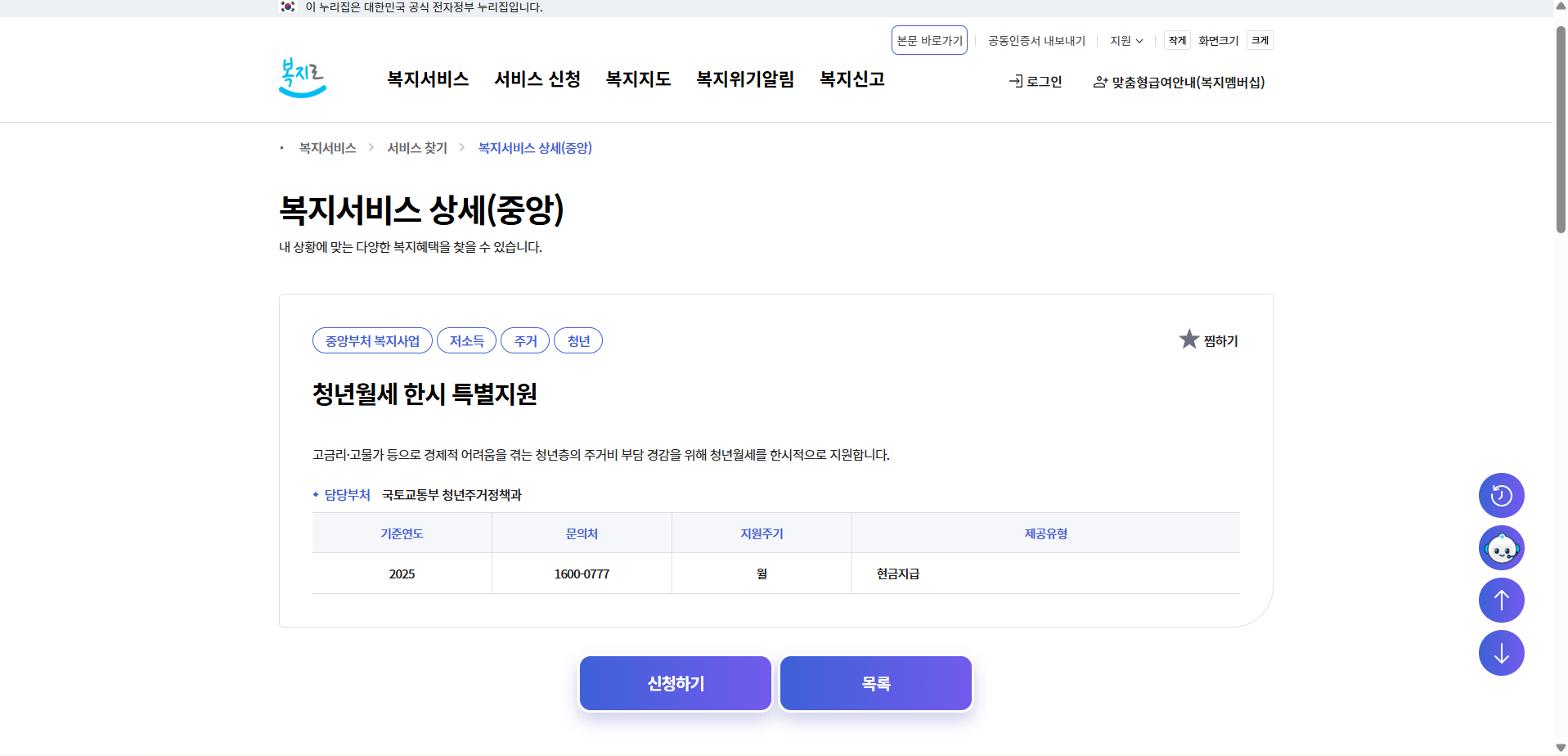 - 복지로 메인 화면에서 “청년월세지원 신청” 메뉴를 선택합니다.