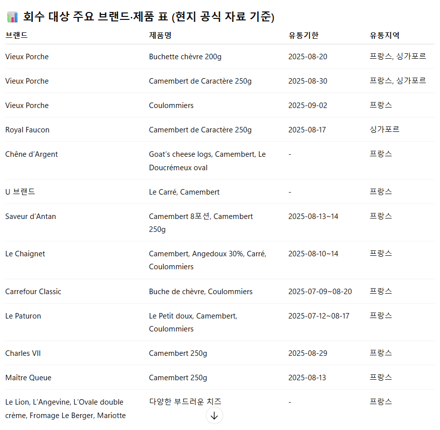 이번 리콜은 프랑스 내에서만 머무르지 않았습니다. 프랑스 대형 유통망인 Leclerc, Carrefour, Auchan 등을 통해 판매된 제품들이 해외로도 수출된 사실이 확인되었기 때문입니다. 특히 싱가포르 식품청(SFA)은 자국에 수입된 Vieux Porche Buchette 200g, Vieux Porche Camembert de Caractère 250g, Royal Faucon Camembert de Caractère 250g을 회수하고, 소비자에게 즉시 섭취를 중단하라는 권고를 내렸습니다. 이들 제품은 Classic Fine Foods, Culina, Indoguna 등 현지 수입사를 통해 유통된 것으로 확인되었습니다. 싱가포르 당국은 해당 제품을 이미 구매한 소비자에게는 증상이 없더라도 폐기하거나 환불받을 것을 권장하고 있습니다.