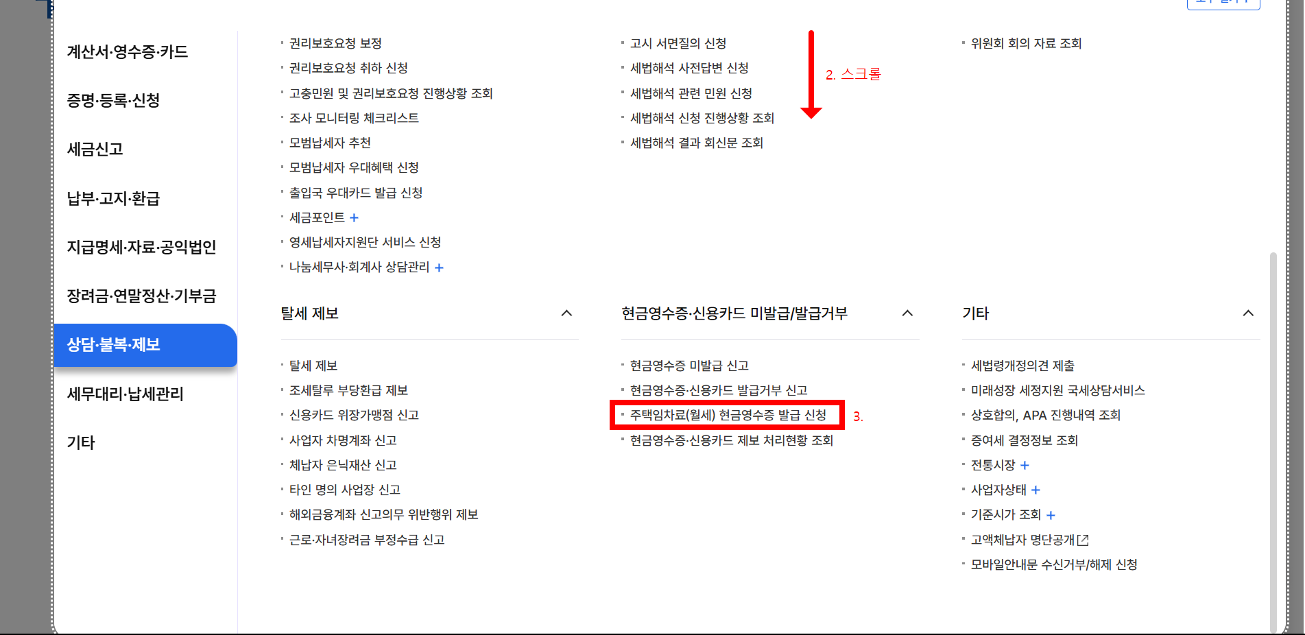홈택스(hometax.go.kr)에 로그인한 후, 상담·불복·제보 → 현금영수증 → 주택임차료(월세) 현금영수증 발급 신청을 클릭합니다. 여기서 '신청하기' 버튼을 누르면 신청 화면이 나옵니다.
