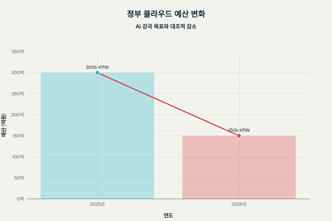가장 충격적인 사실은 AI 3대 강국 로드맵 발표와 동시에 드러난 내년 클라우드 예산 삭감입니다. 기획재정부가 과학기술정보통신부에 배정한 2026년 클라우드 예산은 150억 원으로, 올해 300억 원에서 절반으로 줄었습니다. AI의 핵심 인프라인 클라우드를 홀대하면서 AI 강국을 외치는 것은 마치 도로 없이 자동차만 만들겠다고 선언하는 것과 다름없습니다.