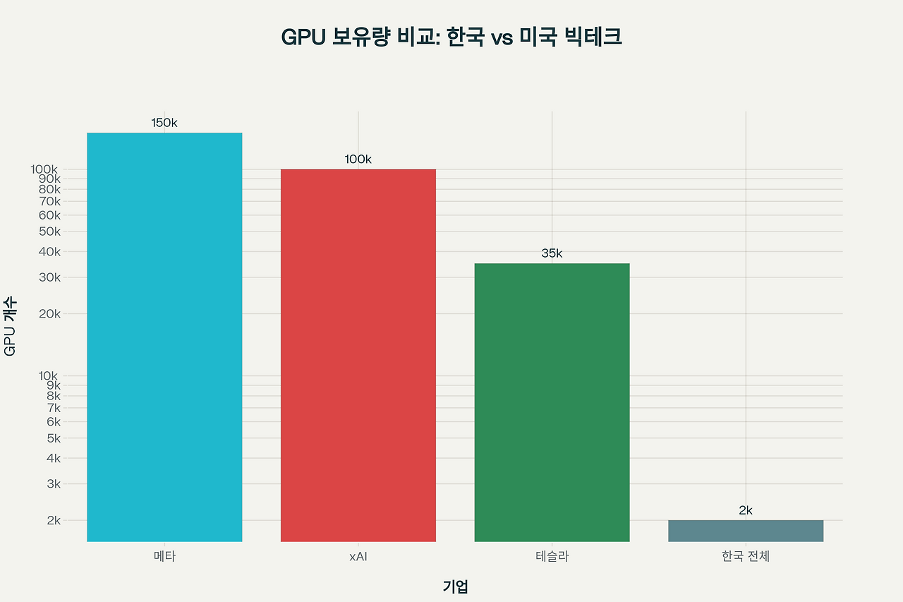 정부가 GPU 5만 장 확보를 약속했지만, 현실은 참담합니다. 소프트웨어정책연구소의 2023년 조사에 따르면 국내 전체 H100 GPU 보유량은 약 2000개에 불과합니다. 이는 메타 한 회사가 보유한 15만 개에 비해 75분의 1 수준입니다. 일론 머스크의 xAI가 10만 개, 테슬라가 3만5000개를 보유한 것과 비교하면 한국의 GPU 인프라가 얼마나 열악한지 알 수 있습니다.